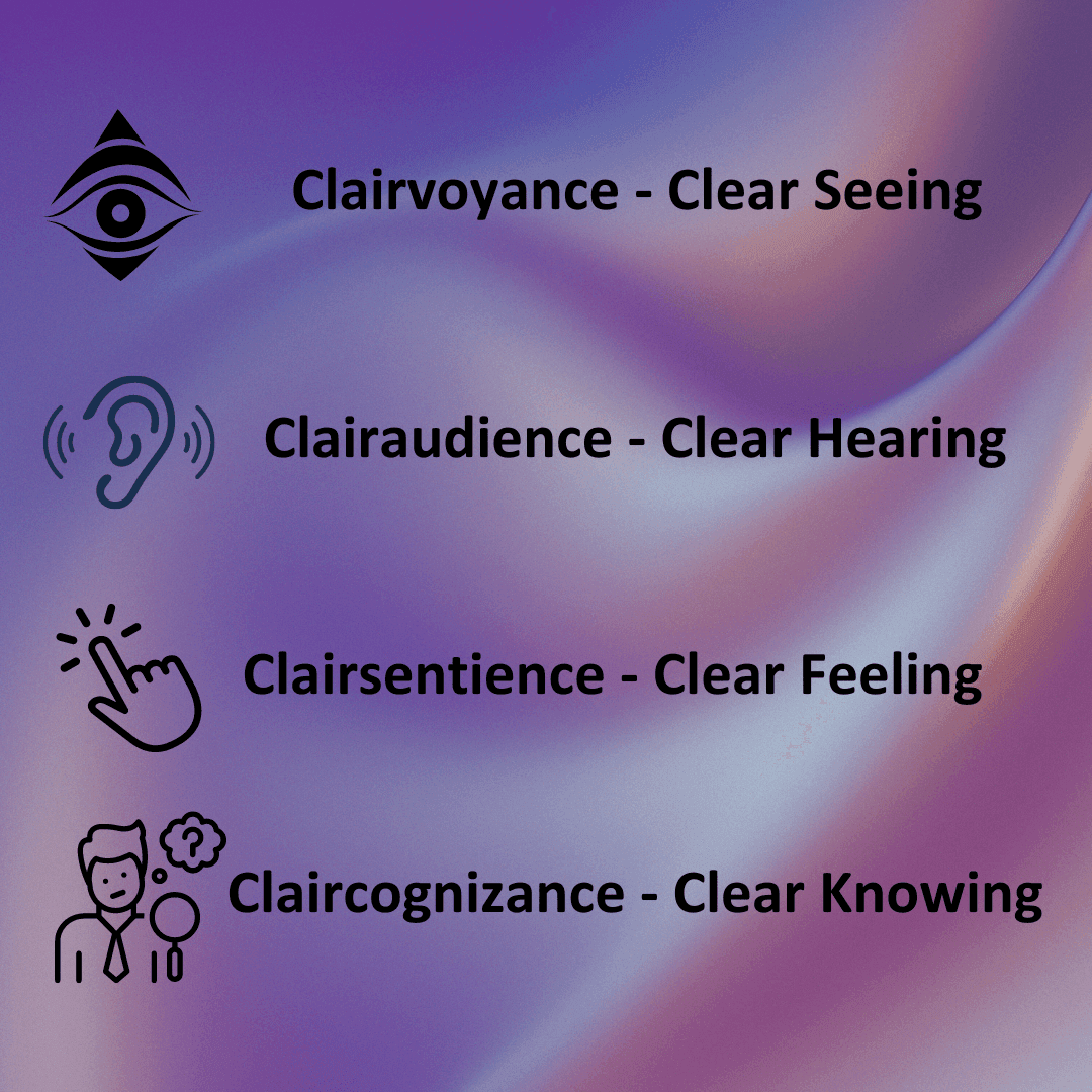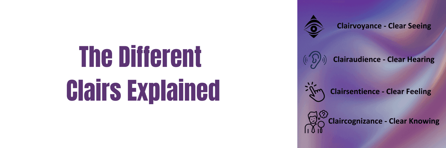You may have heard of the 4 primary clairs – Clairvoyant (clear seeing), Clairaudient (clear hearing), Clairsentient (clear feeling), and Claircognizant (clear knowing). They are the main ways people connect to their intuition and spiritual gifts. Most people will have a predominant Clair – the way they experience their spiritual connection. How they describe their connection – I see, I feel, I know, or I hear. You can grow the connection to your clairs by doing spiritual development, either by joining a circle/class or through your personal meditation and development.
