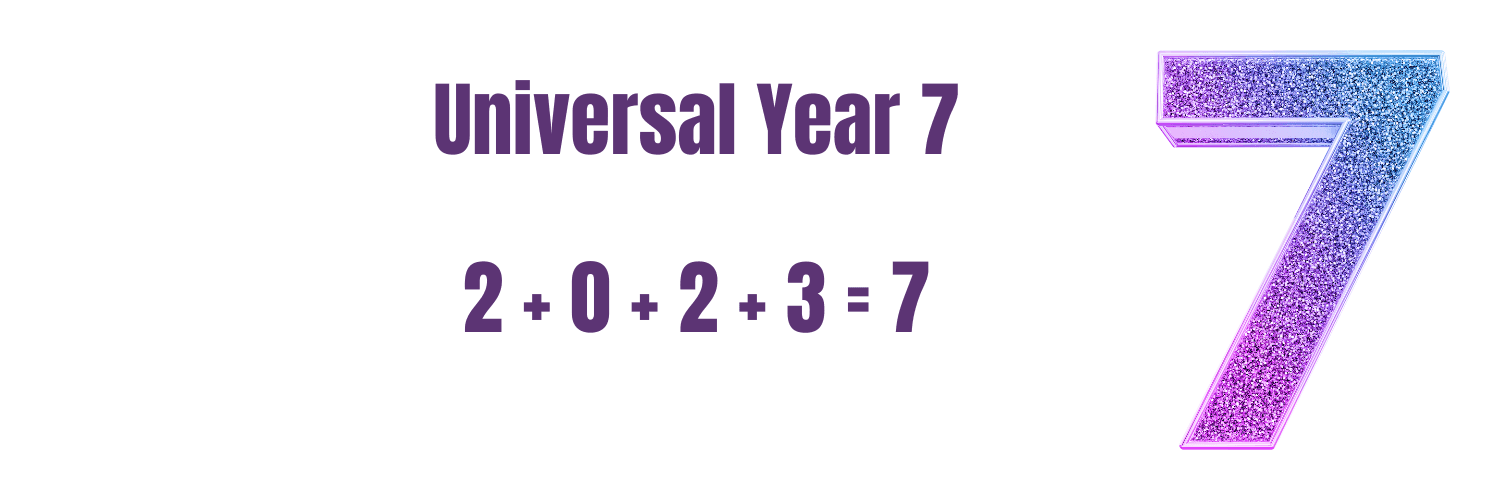 Universal Year 7 (2023). The Universal Year is from 1 January until 31 December. Every living thing/being is affected the numerological energy of the year. While your Personal Year affects you as an individual, starting from birthday to birthday. In order to find your Personal year, add your Day and Month together, and then add the current year – 2023 = 7. When your Personal Year is different to the Univeral Year, then the Universal Year acts as a background influence for the Personal Year. By the same token when your Personal Year is the same as the Universal Year, the influence of this period is magnified.